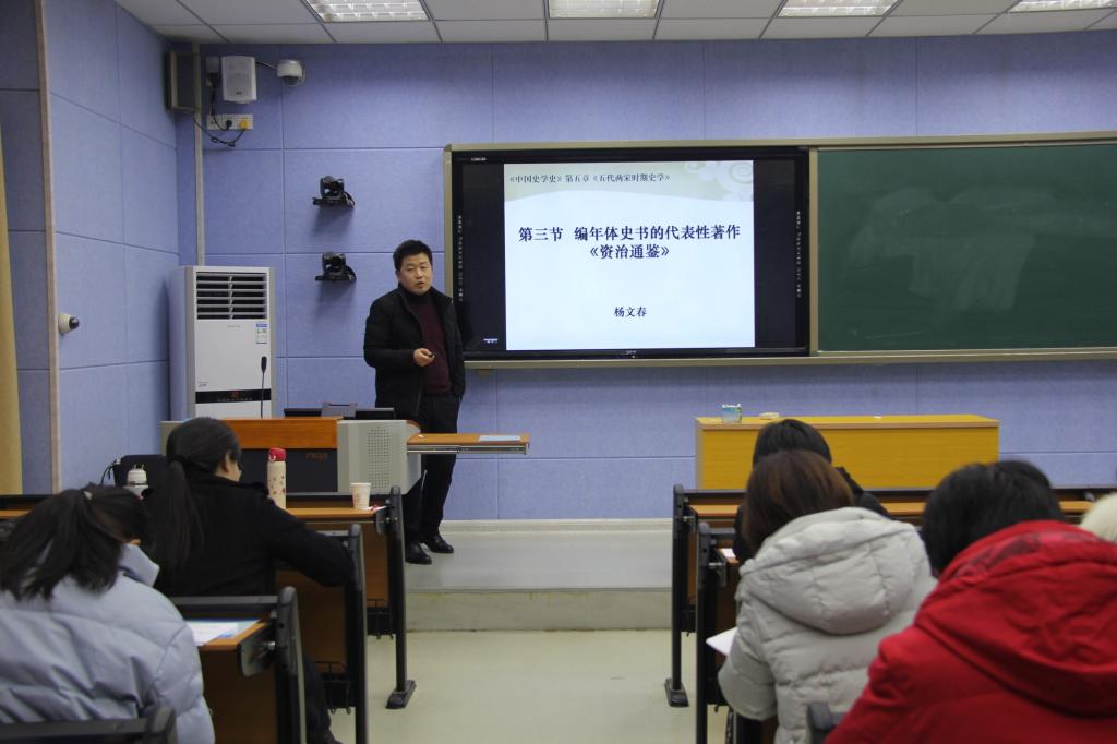 在比赛开始前,宋玉峰详细介绍了比赛规则,八位参赛教师通过抽签决定比赛顺序。顾玲玲老师最先开讲,她以“文化产业项目市场推广与营销策划”为主题,围绕教材分析、教学目标、教学重难点、教学方法、教学过程五个方面展开讲解;随后,慧鹏飞老师选取了《中国历史要籍介绍及选读》中第五章第二节的《汉书》展开说课,深化了大家对《汉书》的理解;接着吕振纲老师以中美关系为例,介绍了国际关系理论;孙启正老师以安徽凤阳小岗村为引子,讲述人民公社制度的建立与解体,加深了对人民公社的了解;张彦晓老师以《三国志》为例,带领大家了解纪传体的创始与发展;邹维一老师从分析教材、讲解教学方法、提出问题等方面入手,介绍了中国社会史教学方法;张熙老师讲授了非物质文化遗产的传承主体,生动形象,使人印象深刻;杨文春老师讲述了编年体史书《资治通鉴》的相关内容,重点突出,形式新颖。