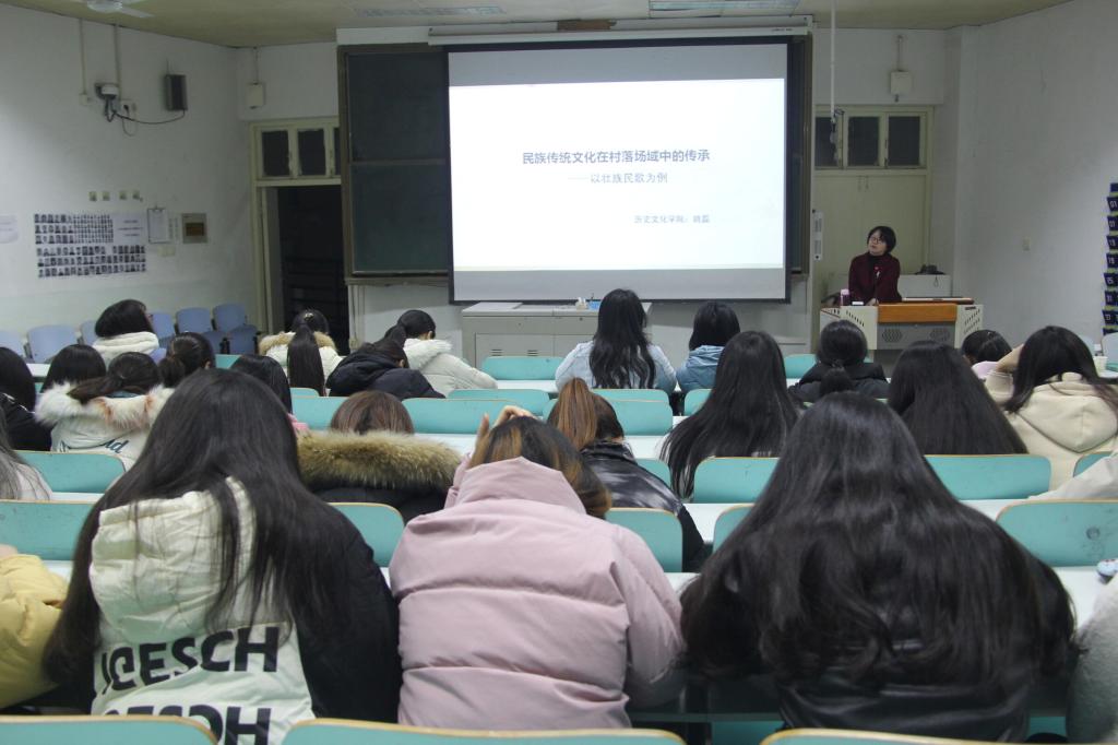 11月27日晚,yL23411永利官网登录姚磊老师在人文楼609教室作题为“民族传统文化在村落场域中的传承”的人文视野讲座,2018、2019级文化产业管理班全体学生到场听讲。