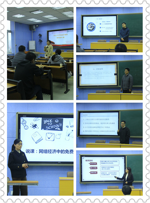 副院长孙炜介绍了比赛规则,五位参赛教师通过抽签决定比赛顺序。李海霞老师主要讲了《网络经济中的免费模式》,李老师从身边中司空见惯的现象讲起,深入浅出的为我们讲述了网络免费经济的相关知识。邹维一老师主要讲了《博物馆学概论——藏品鉴定与建档》,邹老师注重线上线下教学,从搭建一个属于自己的博物馆开始,为我们讲述了如何为文物鉴定和建档。庄宏忠老师主要讲了《气候变迁对社会历史发展的影响——明清小冰期与社会波动》,庄老师从教材、教法、学法、教学过程4个方面为我们介绍了说课内容。马志超老师主要讲了《西欧诸国——德国》,马老师注重运用多媒体教学,为我们讲述了德意志王国的相关知识。黄日初老师主要讲了《金朝历史》,黄老师在讲课时注重运用多媒体和心理暗示法,用各种文物图片史料,构建历史情境,以便激发学生的学习兴趣,让学生能够“回归”历史场景,从中体验、感悟历史。