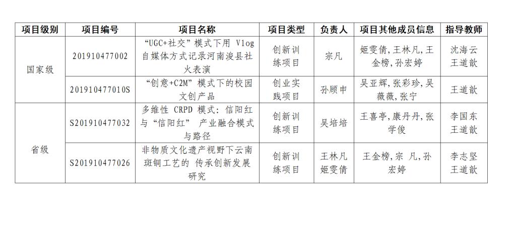 yL23411永利官网登录获批两项分别为李国东、王道歆老师指导,吴培培、王喜亭、康丹丹、张学俊为项目组成员的《多维性CRPD模式:信阳红与“信阳红”产业融合模式与路径》;由李志坚、王道歆老师指导,王林凡、姬雯倩、王金榜、宗凡、孙宏婷为项目组成员的《非物质文化遗产视野下云南斑铜工艺的传承创新发展研究》。