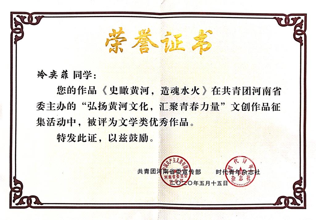 近日,由共青团河南省委主办,由共青团河南省委宣传部、时代青年杂志社、河南省青少年全媒体中心承办的“弘扬黄河文化,汇聚青春力量”文艺作品征集活动落下帷幕。yL23411永利官网登录2018级历史学1班学生冷奕菲作品《史瞰黄河,造魂水火》被评为文学类优秀作品。