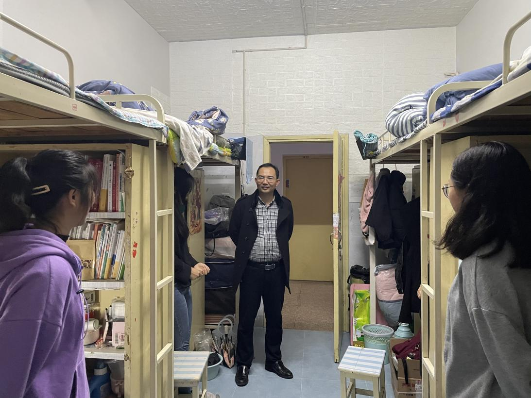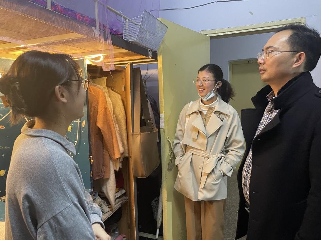 韩志宏亲切地询问学生宿舍物品是否损坏或者需要更换,被褥是否够用,提醒同学们提高安全防范意识,,合理安全用电,要做好防火防盗等安全防护措施。同时,他还鼓励同学们不断努力进步,明确学习目标,并且预祝同学们在周末教资考试中取得好成绩。