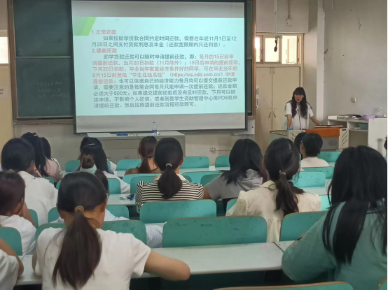 会上,吴慧娟讲解了国家助学贷款的还款政策、还款流程、展期办理及违约后果等相关内容,希望大家要严守贷款合同,履行还款义务,做一个诚实守信、奉献社会的人。随后,她向学生们普及了相关征信常识,并用部分还款违约事例及其造成的不良影响提醒学生务必在规定期限内还款,及时了解相关信息,避免因还款逾期被纳入征信系统,对未来工作和生活造成不良影响。