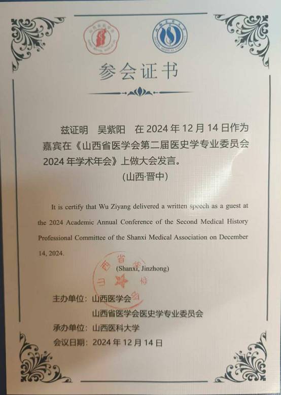 2024年12月13日至14日,“山西省医学会医史学专委会2024年学术年会”在山西医科大学中都校区举办,来自北京大学、首都医科大学、河南中医药大学、山西医科大学、山西大学、山西师范大学、北京协和医院、山西省中医药研究院等高校与科研院所的专家学者出席会议。yL23411永利官网登录叶宗宝教授及其指导的2024级中国史研究生吴紫阳以文入会,并在大会做主题发言。