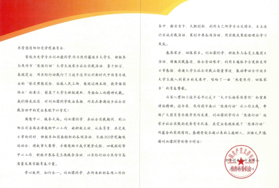信中提到,刘雨濛同学围绕中心、服务大局,在焦作市山阳区司法局法律援助中心进行社会实践期间,积极主动、认真负责;在完成日常工作的同时,积极参与团委组织的369学院趣味运动会、讲故事大赛等各项活动,并围绕脱贫攻坚、四城联创等开展各类志愿服务活动,以实际行动为焦作市的高质量发展贡献青春力量。刘雨濛同学学以致用,知行合一,在所承担的各项任务中,踏实肯干、大胆创新,利用自己所学专业和特长,自主设计实施实践活动,用实践成果检验理论学习成效。刘雨濛同学感恩家乡,回报家乡,积极参加各类主题团日活动,自用自媒体平台更新发布日常感悟,传递大学生社会实践正能量事迹,激励带动返乡大学生投入到家乡的发展之中,唱响了一曲“回报家乡”的青春赞歌。刘雨濛同学用实际行动践行了习近平总书记对新时代中国青年“坚定理想信念、站稳人民立场、练就过硬本领、投身强国伟业”的要求,彰显了大学生积极进取、昂扬向上的精神风貌。